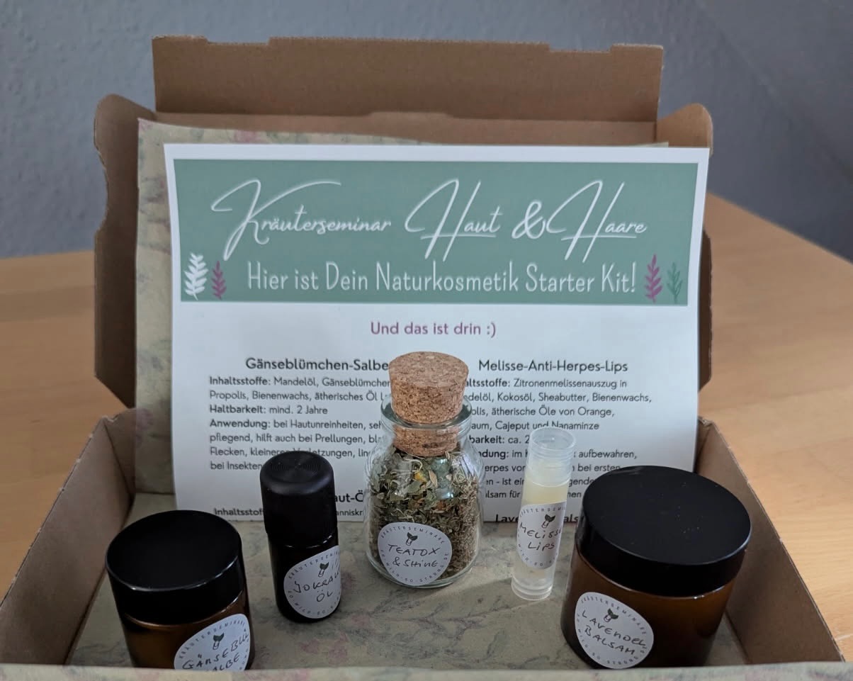🌿 „Naturkosmetik-Starter-Kit“ für dich mit selbst hergestellten kräuterbasierten Pflegeprodukten (im Preis inklusive, wird dir vor dem Seminar zugesendet)